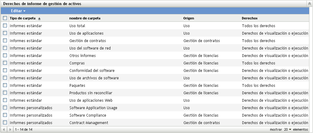 ZENworks® Asset Management permite gestionar los derechos del administrador en cada carpeta de informes. Los derechos asociados a cada carpeta se aplican a todos los informes incluidos dentro. Por ejemplo, si tiene todos los derechos para una carpeta, puede editar los informes de esa carpeta; pero con los derechos de visualización o ejecución, sólo puede ver los informes de la carpeta y ejecutarlos.