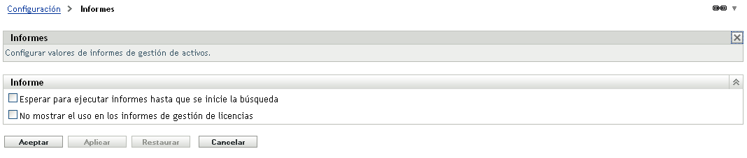 Hay dos ajustes de la zona de gestión de ZENworks® relacionados con los informes de gestión de activos. Uno determina cómo se inician los informes y el otro si el uso del software se mostrará en todos los informes.