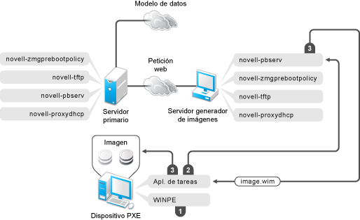 La aplicación ZENworks Work To Do (ZENworks Third-Party Imaging) solicita los detalles del trabajo de los servicios de prearranque asignados y lanza el motor correspondiente de generación de imágenes de otros fabricantes para realizar el trabajo.
