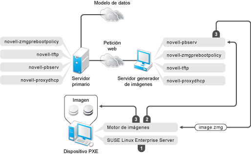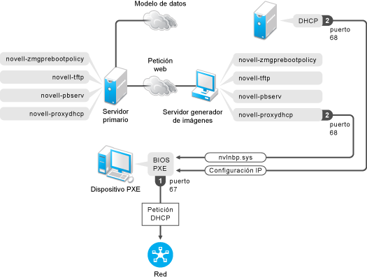 En las siguientes secciones se explica cómo funcionan los servicios de prearranque para el arranque PXE, ZENworks Imaging y la generación de imágenes de otros fabricantes en el satélite generador de imágenes: