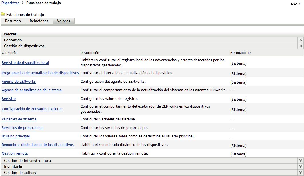 Si el valor de configuración se aplica a los dispositivos, este valor lo heredarán todos los dispositivos de la zona, a no ser que se sustituya en el nivel de carpeta o de dispositivo.