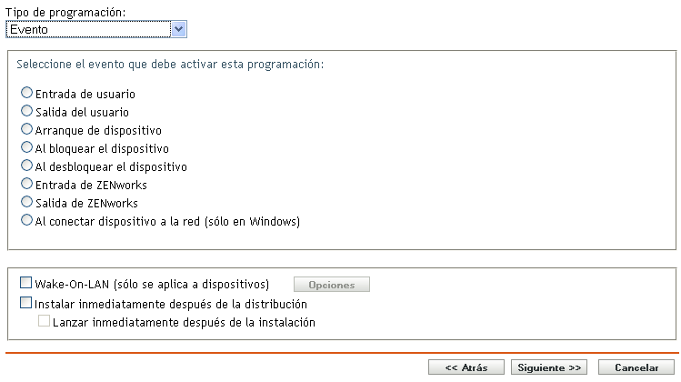 Esta opción de programación permite especificar el evento que debe activar la acción programada.
