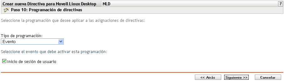 Incluso si no incluye este ajuste en la directiva, el sistema comprobará si está instalado Novell Linux Desktop. Si no se detecta Novell Linux Desktop, se generará un mensaje de error y no se aplicará la directiva.