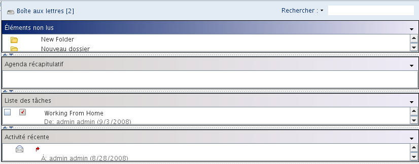 Un panneau affiche une vue d'informations personnalisée dans GroupWise. Le dossier Accueil par défaut, par exemple, comprend le panneau Messages non lus, lequel affiche la liste des éléments que vous n'avez pas encore lus. Le panneau Liste des tâches est un autre panneau par défaut du dossier Accueil. Ce panneau affiche les éléments qui se trouvent dans votre liste des tâches.