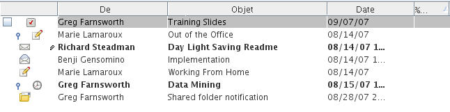 La liste des éléments d'un dossier est divisée en colonnes. Les informations relatives aux éléments de cette liste apparaissent dans chaque colonne. Par exemple, l'objet et la date d'envoi apparaissent dans des colonnes différentes. Vous pouvez personnaliser l'affichage des colonnes de chaque dossier.