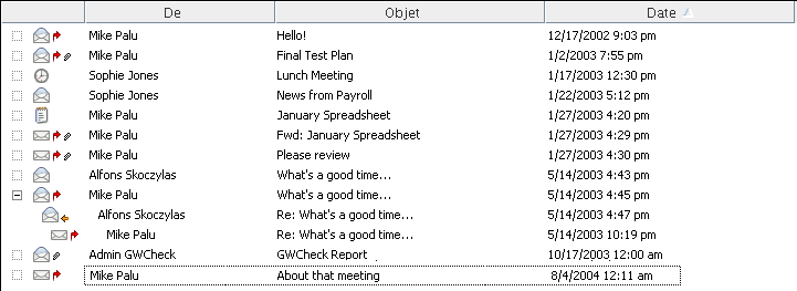 Suivis de discussion affiche les échanges électroniques d'un élément d'origine ainsi que toutes les réponses qui lui ont été faites sous forme de groupes hiérarchisés. Par défaut, seuls les éléments reçus sont affichés dans un suivi de discussion.