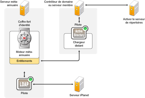 Il existe différentes méthodes pour configurer Identity Manager afin de profiter de toutes ses caractéristiques. La Figure 4-1 représente une configuration de base d'Identity Manager, qui provisionne les utilisateurs en synchronisant les données. Peu importe la configuration d'Identity Manager, vous commencez toujours par un système de base.