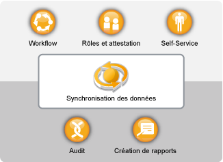 Si cela ressemble fort à une journée de travail standard pour vous ou pour quelqu'un d'autre dans votre organisation, Identity Manager peut vous aider. En fait, les principales fonctionnalités d'Identity Manager, présentées sur la figure qui suit, peuvent vous aider à automatiser l'ensemble de ces tâches et bien d'autres encore. Centrées sur la synchronisation des données multi-système pilotée par les stratégies de votre entreprise, ces fonctionnalités (workflow, rôles, attestation, self-service, audit et création de rapport) se combinent pour automatiser les processus impliqués dans le provisioning des utilisateurs et la gestion des mots de passe, deux des tâches les plus délicates et les plus longues pour un service informatique.