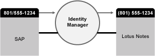 Dans le diagramme suivant, la base de données des ressources humaines SAP est la source experte du numéro de téléphone d'un utilisateur. Le système Lotus Notes utilise également des numéros de téléphone, c'est pourquoi Identity Manager convertit le numéro dans le format requis et le partage avec le système Lotus Notes. Chaque fois que le numéro de téléphone change dans le système de ressources humaines SAP, il est synchronisé sur le système Lotus Notes.