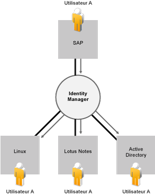 La gestion des données des utilisateurs existants n'est que le début des fonctionnalités de synchronisation des données d'Identity Manager. Identity Manager peut en outre créer de nouveaux comptes utilisateur et supprimer des comptes existants d'annuaires tels qu'Active Directory, de systèmes tels que PeopleSoft et Lotus Notes et de systèmes d'exploitation tels que UNIX et Linux. Par exemple, lorsque vous ajoutez un employé à votre système de ressources humaines SAP, Identity Manager peut créer automatiquement un compte utilisateur dans Active Directory, un compte dans Lotus Notes et un compte dans un système de gestion de comptes NIS Linux.