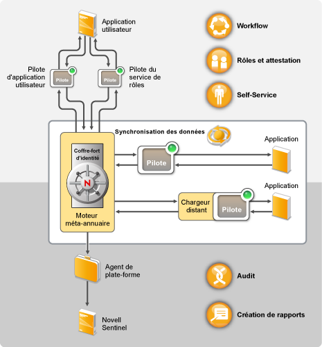Le diagramme suivant illustre les composants d'architecture de haut niveau qui fournissent les fonctionnalités de Novell® Identity Manager présentées dans le Section 1.0, Identity Manager et l'automatisation des processus d'entreprise : synchronisation des données, workflow, rôles, attestation, self-service, ainsi qu'audit et création.