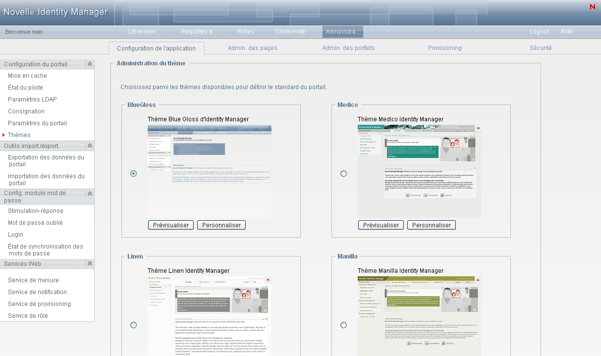 Configuration de l'application : permet de configurer la mise en cache, les paramètres LDAP, la consignation, les thèmes et les paramètres du module de mot de passe.