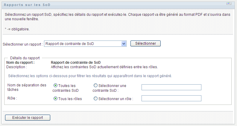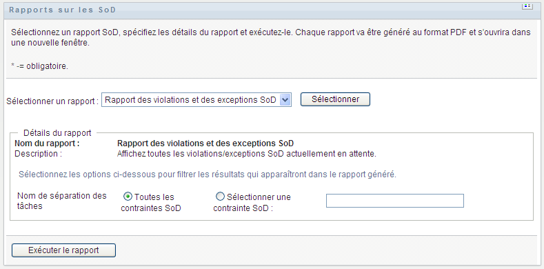Sélectionnez pour afficher les violations et les exceptions en attente parmi toutes les contraintes SoD. Vous pouvez aussi choisir pour mettre l'accent dans le rapport sur les violations d'une seule contrainte SoD.