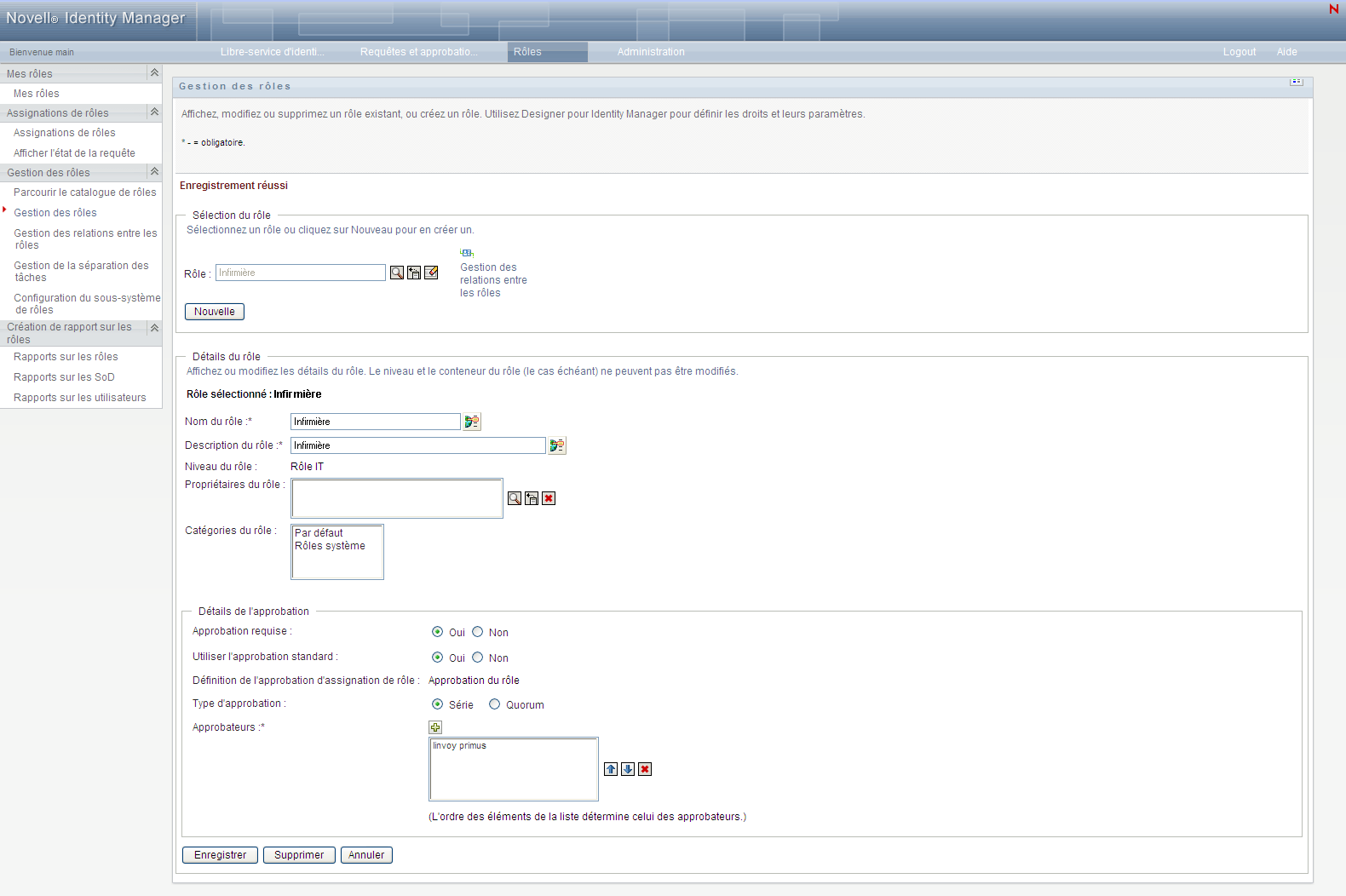 La page Gérer les rôles affiche le nom du rôle sélectionné dans la section .