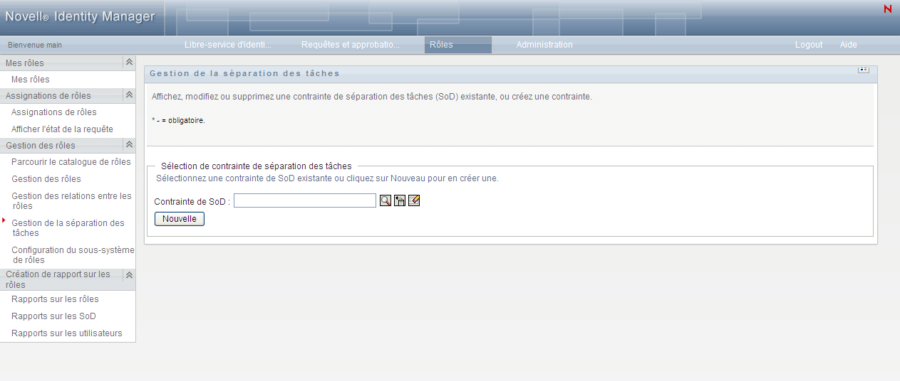 Pour afficher ou modifier une contrainte SoD existante, utilisez les outils ou pour sélectionner la contrainte. Pour plus de détails sur l'utilisation des outils et , reportez-vous à Utilisation du bouton de sélecteur d'objet pour effectuer une recherche.
