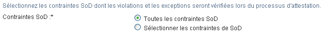 Vous devez sélectionner au moins une contrainte de SoD avant de lancer un processus d'attestation. En revanche, il n'est pas obligatoire de sélectionner une contrainte de SoD pour enregistrer une requête.