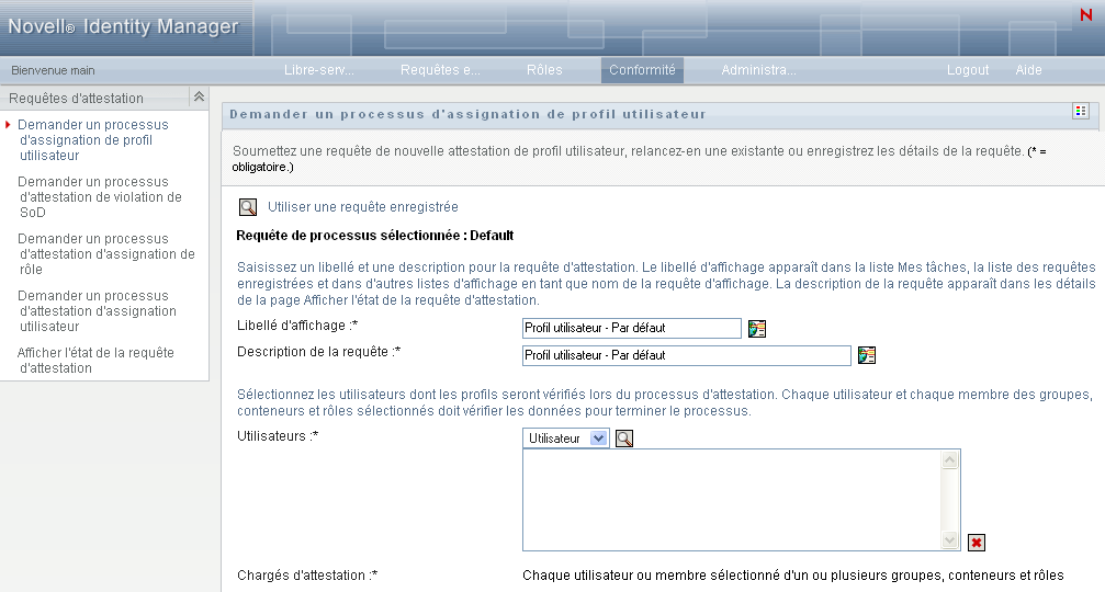 Par défaut, l'onglet Conformité affiche la page Demander un processus d'attestation de profil utilisateur.