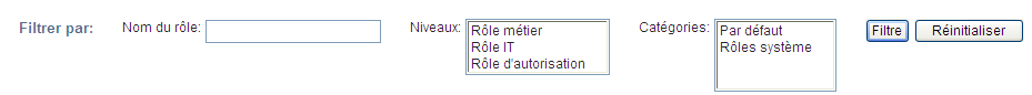 Filtrage par catégorie et niveau de rôle (accessible via l'opération Parcourir le catalogue de rôles)