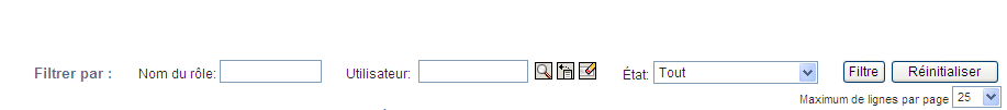 L'onglet Rôles de l'application utilisateur fournit des filtres qui permettent d'afficher uniquement les données qui vous intéressent. Vous pouvez également limiter le volume de données par page à l'aide du paramètre Maximum de lignes par page. Voici quelques exemples de filtres :
