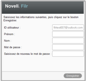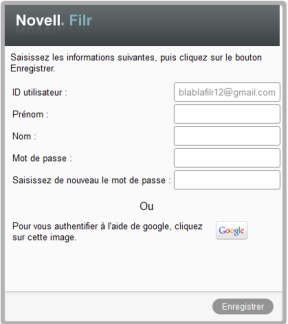 Si l'adresse électronique de l'utilisateur n'est ni une adresse Google ni une adresse Yahoo, mais l'adresse électronique d'une entreprise par exemple (telle que luc@novell.com), l'utilisateur doit s'enregistrer sur le site Filr pour se connecter.