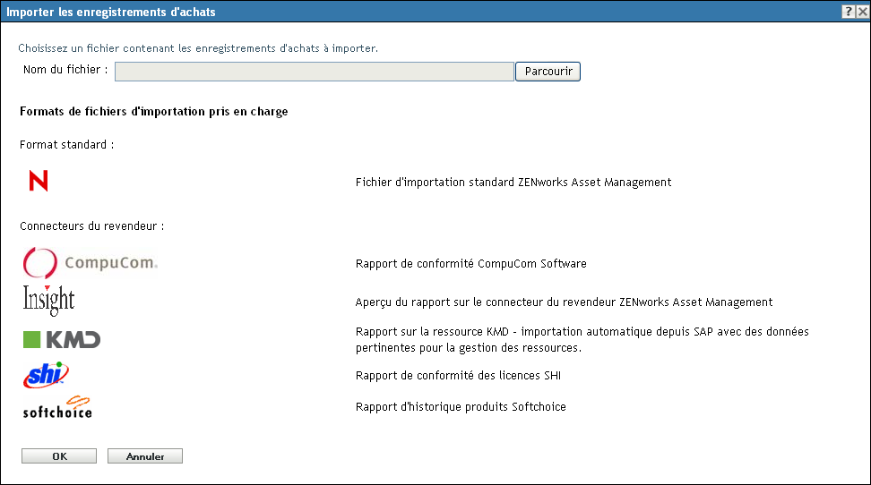 La manière la plus simple de créer des enregistrements d'achats consiste à importer ceux-ci à partir des fichiers fournis par les revendeurs. ZENworks Asset Management peut importer des enregistrements d'achats de CompuCom*, Insight, KMD/SAP*, SHI* et Softchoice*. En outre, il existe un format d'importation générique que vous pouvez utiliser (reportez-vous à la section Utilisation de fichiers d'importation).