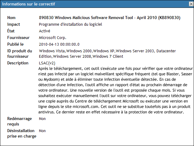 Figure 4-8 Informations sur le correctif sélectionné