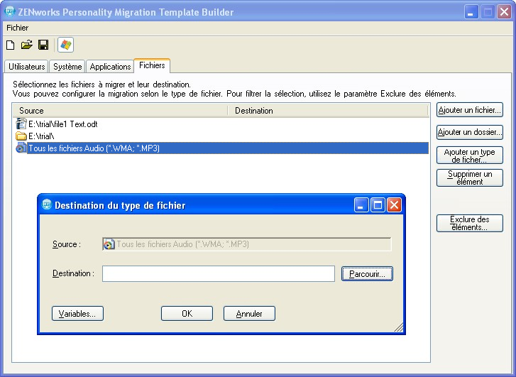 Cliquez sur pour sélectionner une variable qui l'assigne à l'emplacement de destination. Par exemple, si vous voulez faire migrer le fichier nommé fichier1 vers le répertoire favoris, cliquez sur la variable et annexez-y \fichier1.