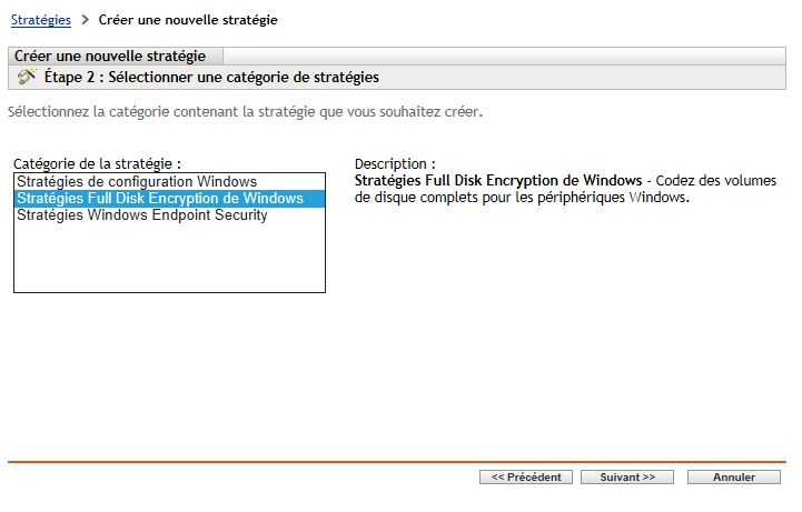 Sur la page Sélectionner une catégorie de stratégies, sélectionnez Stratégies Full Disk Encryption de Windows, puis cliquez sur Suivant.