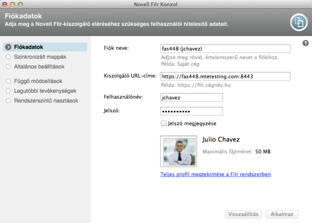 Az asztali Filr alkalmazás által használt fiókadatok és Filr-kiszolgálói adatok később is bármikor módosíthatók: