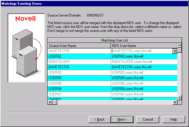 Fare clic sulla freccia accanto al nome utente NDS per visualizzare un elenco a discesa contenente tutti gli utenti NDS con lo stesso nome (incluso il contesto) dell'utente NetWare 3 adiacente. Selezionarne uno e proseguire con l'utente NetWare 3 successivo.