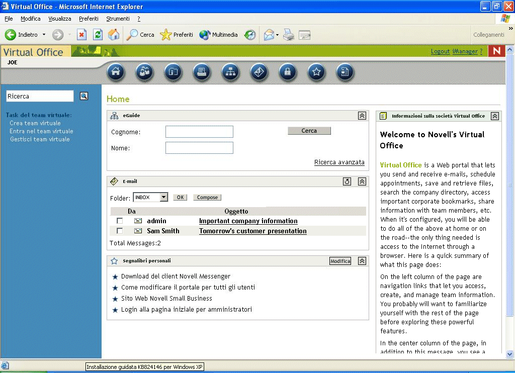 Se è stato installato il modello Server per la collaborazione Novell Small Business con Virtual Office, la pagina di Virtual Office diviene il portale di default per gli utenti finali. Sarà possibile personalizzarla secondo le proprie esigenze aziendali utilizzando i collegamenti forniti. Per ulteriori informazioni sulla configurazione di Virtual Office, vedere i collegamenti disponibili sulla pagina e il manuale Guida alla configurazione di Novell Virtual Office.