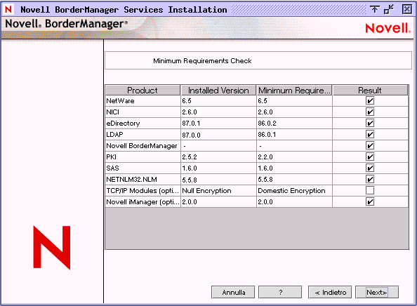 L'installazione verrà interrotta se i requisiti minimi, con l'eccezione dei moduli TCPIP e di iManager 2.0, non sono soddisfatti. Soddisfare i requisiti in base alle informazioni visualizzate nella figura qui sopra e riavviare l'installazione. Se i requisiti di base per i moduli TCPIP non sono soddisfatti, viene visualizzato un avviso. È possibile ignorare l'avviso e proseguire con l'installazione; se si intende utilizzare i servizi VPN, sarà tuttavia necessario copiare i moduli TCPIP corretti in un secondo momento (vedere Prerequisiti per l'installazione di Novell BorderManager 3.8).