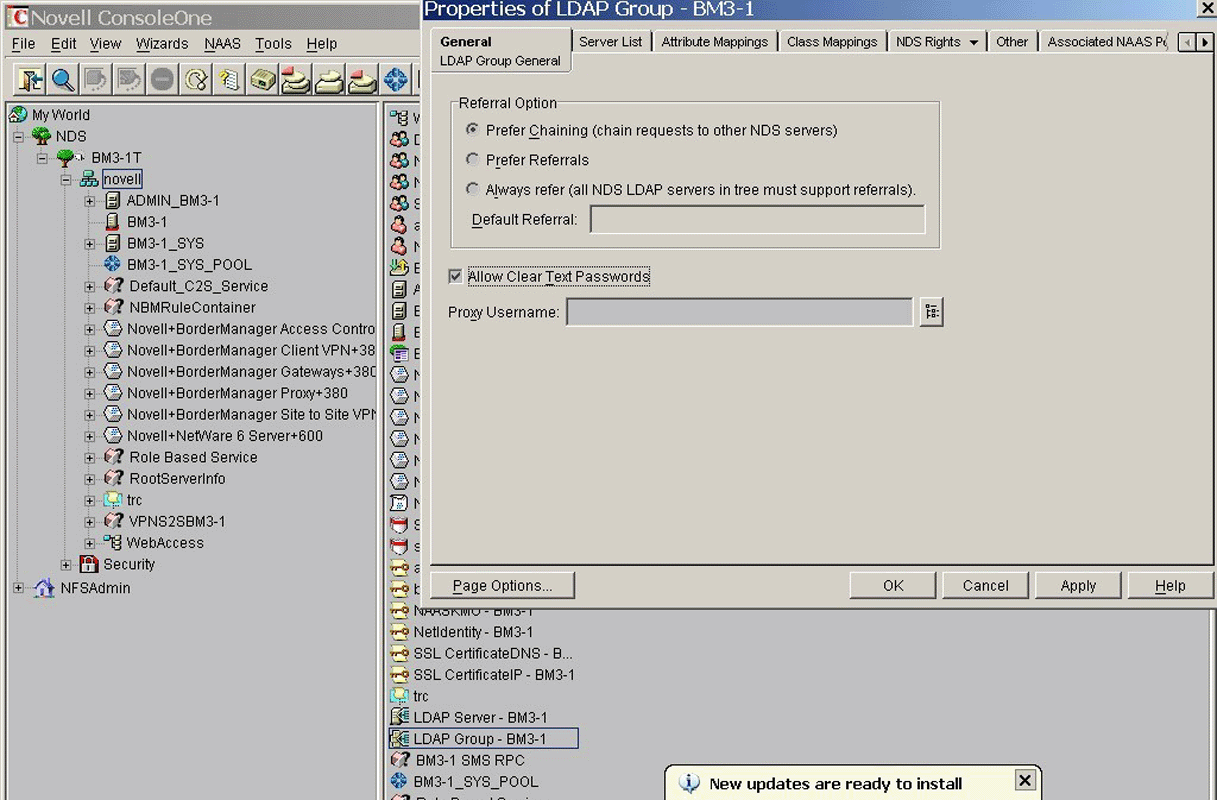 Per abilitare le parole d'ordine non cifrate, eseguire il login a ConsoleOne, fare doppio clic sul contesto del server sul quale si sta installando Novell BorderManager 3.8, selezionare l'oggetto LDAP Group e fare clic con il pulsante destro del mouse su > Proprietà. Selezionare la casella Consenti parole d'ordine non cifrate (per eDirectory 8.6.2) o deselezionare la casella Richiedi TLS per l'associazione semplice con parola d'ordine (per eDirectory 8.7.1).