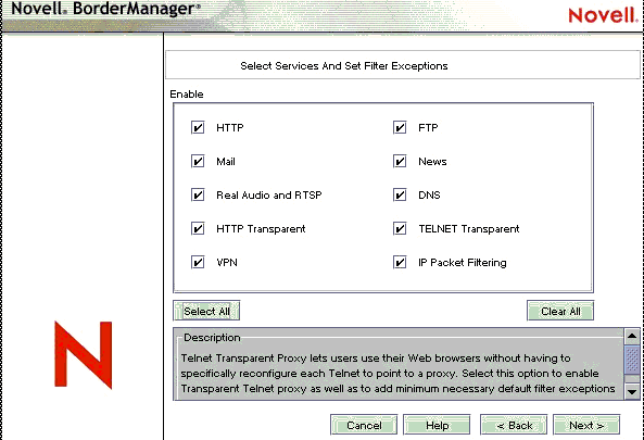 La pagina successiva elenca i servizi di Novell BorderManager 3.8 che verranno installati. I servizi sono:
