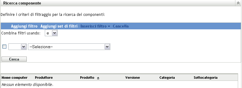Il pannello Ricerca componente consente di selezionare i filtri e i gruppi di filtri per un particolare componente e di visualizzare un elenco dei componenti insieme alle seguenti informazioni: