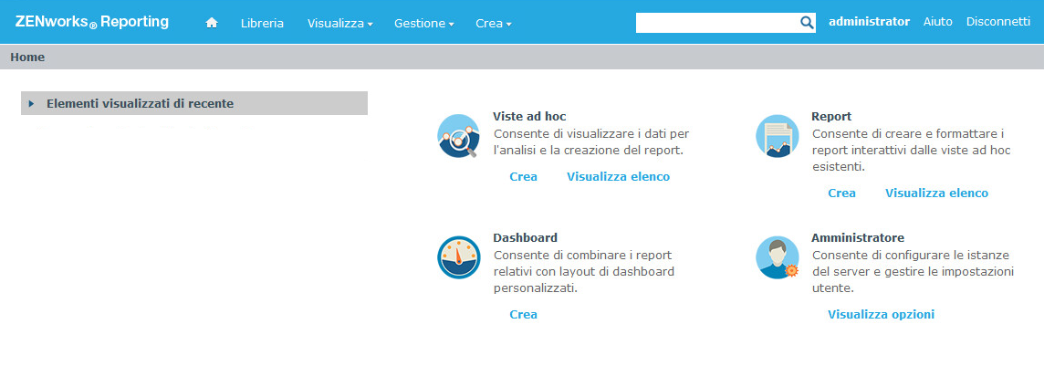 Amministrazione: avvia la pagina Utenti e ruoli. Solo gli amministratori possono visualizzare questo menu e accedervi. Per ulteriori informazioni, vedere Sezione 5.0, Gestione di ZENworks Reporting.