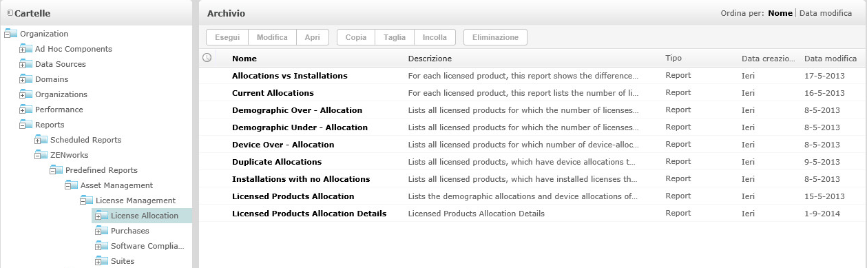 L'archivio è lo spazio di memorizzazione interna di rapporti, viste di analisi e file correlati del server. È organizzato in cartelle che contengono risorse quali file system. Tuttavia, diversamente da un file system, l'archivio viene memorizzato come database privato accessibile direttamente solo da ZENworks Reporting.