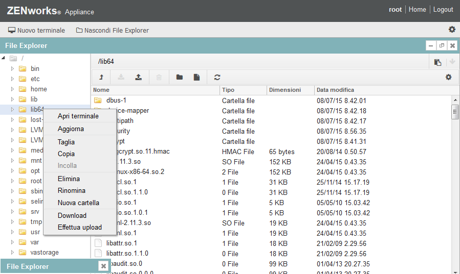 File Explorer permette di esplorare il file system (SLES -Unix) dell'applicazione, nonché di seguire un percorso di navigazione, effettuare l'upload, il download, aggiornare, rinominare, creare, cancellare o tagliare, copiare e incollare.