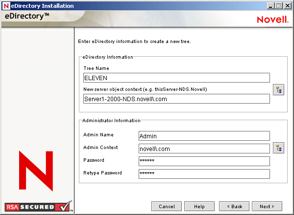 eDirectoryのインストール画面で必要な情報を入力し、[次へ]をクリックします。
