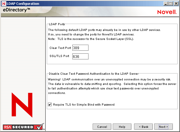 LDAP単純バインドでは、DNおよびパスワードのみが要求されます。パスワードはクリアテキスト形式です。ポート389を使用する場合、すべてのパケットはクリアテキスト形式です。デフォルトでは、eDirectoryインストールの実行中にこのオプションは使用できません。