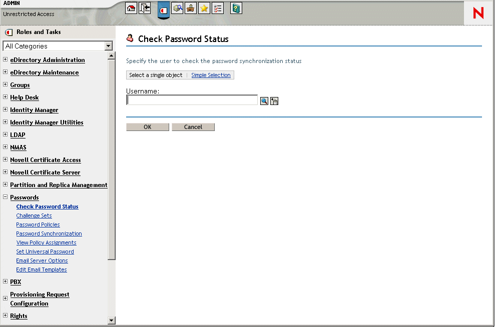 メモ:アイデンティティボールトでは、[パスワードステータスの確認]アクションは、ユニバーサルパスワードではなくNDSパスワードを確認することに注意してください。したがって、ユーザのパスワードポリシーでNDSパスワードをユニバーサルパスワードに同期するよう指定されていない場合は、必ず、パスワードが同期されていないとレポートされます。配布パスワードおよび接続システムのパスワードは同期されないことがありますが、NDSパスワードおよび配布パスワードの両方がユニバーサルパスワードに同期されない限り、[パスワードステータスの確認]は正確とは限りません。