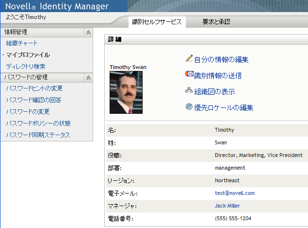 他のユーザおよびグループの詳細情報にリンクする例を次に示します。 Timothy Swan ( マーケティング担当副社長)がIdentity Managerユーザアプリケーションにログインし、[マイプロファイル]ページを開きます。