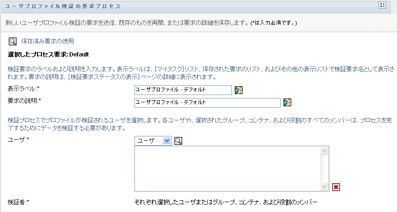[]フィールドで、テキストが読み込み専用になっていることに注意してください。ユーザプロファイル検証プロセスでは、検証者は[]フィールドで選択されたユーザと、[]フィールドで追加した任意のグループ、役割、およびコンテナのすべてのメンバーです。これは、各ユーザは自身のプロファイルの検証者でなければならず、他のユーザは他のユーザの検証者になることはできないためです。