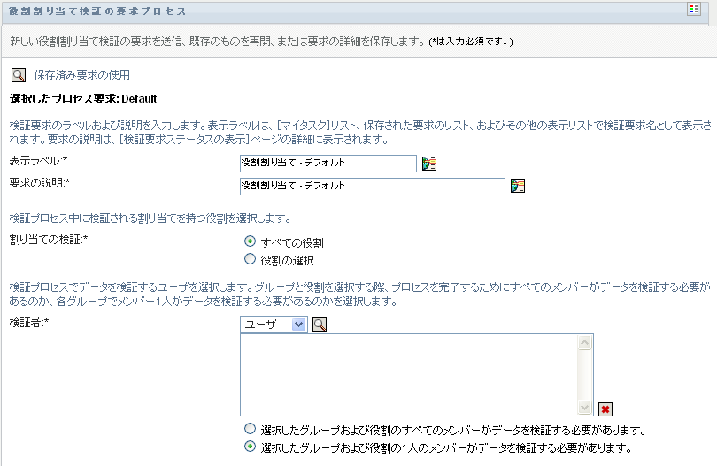 []アクションでは、選択した役割の割り当ての正確性を確認するための検証プロセスを開始できます。また、検証要求に関連付けられている詳細(パラメータおよびフォーム値など)を後からの要求のための事前入力フォームとして保存するオプションも提供します。