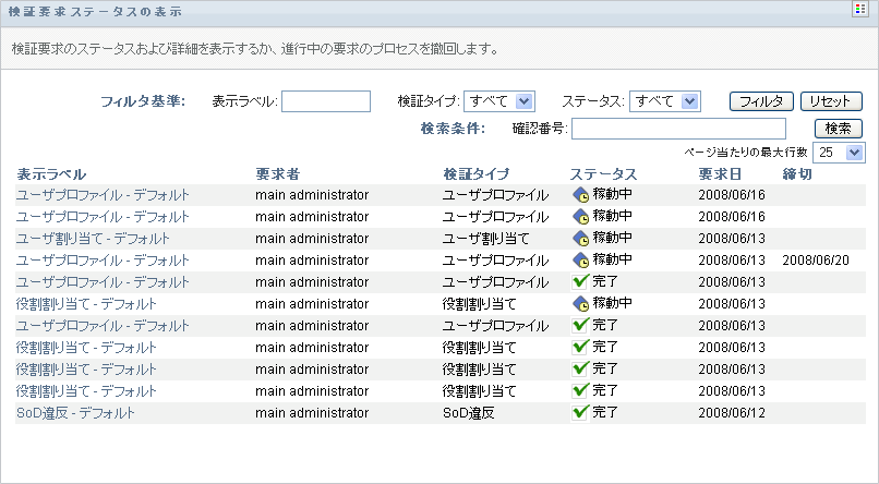 整合性モジュール管理者および検証マネージャが[検証要求ステータスの表示]ページで参照可能な項目に制限はありません。これらの役割の両方で、すべての検証要求に関するステータス情報へのアクセスが許可されます。