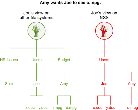 Because NSS is not a POSIX file system, NSS rights don’t behave like standard POSIX rights. NSS volumes keep track of trustee assignments; all trustee assignments are synchronized between NCP and NSS. For NSS volumes, access is based on trustee rights for the user (UID) rather than the permissions (UID, GID, and mode bits). This makes things simpler because Linux/POSIX-based users (Local, SSH, and Samba) do not have more rights than the same user would have if he were accessing files through NCP. This makes NSS easier to manage.