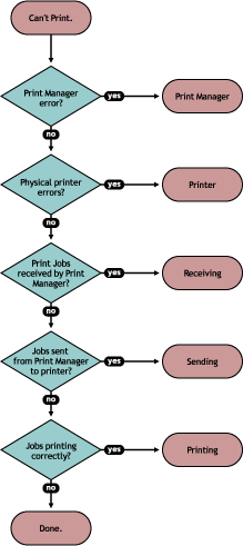 Using the iPrint Manager Health Monitor, you can determine and resolve many printing problems. This section discusses how to troubleshoot print system errors. The following flowcharts show you the basic steps you can do to quickly determine errors.