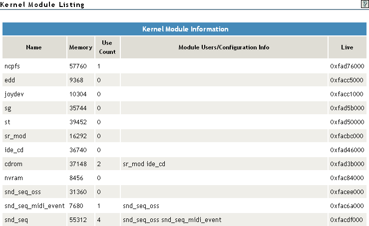 Clicking the link in the navigation frame displays the Kernel Module Listing page. On this page you can view the status of the modules that have been compiled into the Linux kernel on this system. Printing this page can be useful to document your system as you make changes or upgrades to it in the future.