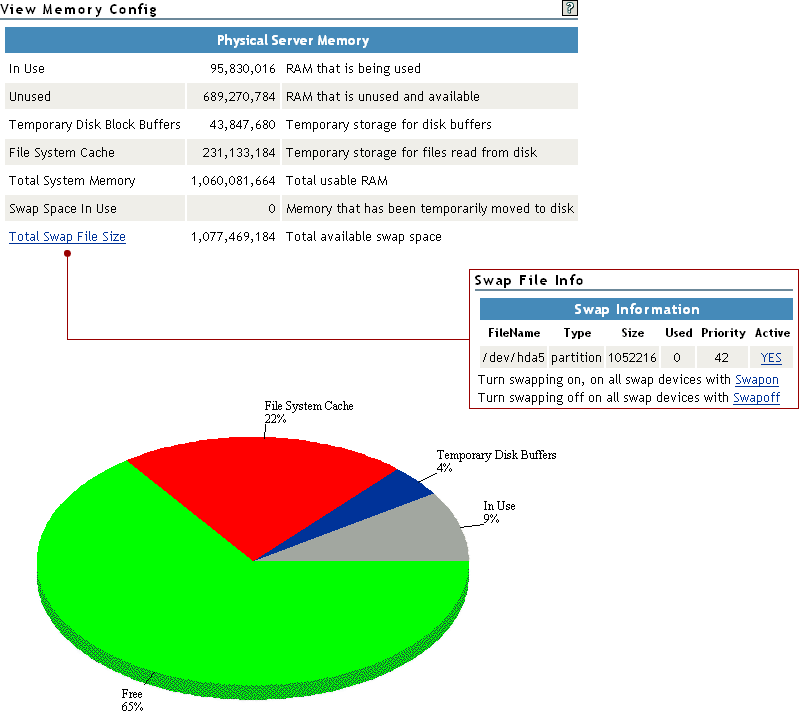 The link goes to a Swap File Information page that provides a very quick snapshot of every swap filename, type of swap space, and total and used sizes (in kilobytes) on the server including the following information: