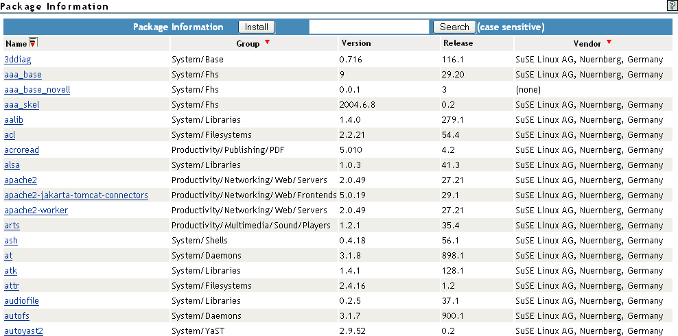 The selected package’s file path is transferred to the field on the Package Installation page. When the button is clicked on the View Package Information page, Novell Remote Manager attempts to install the specified RPM file using the Linux RPM utility. |